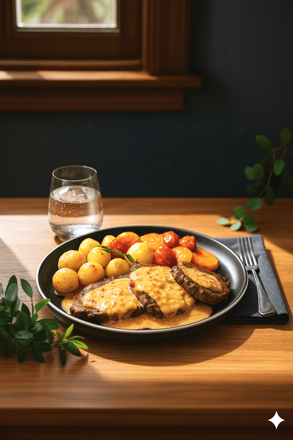 Un exquisito lomo en salsa demiglace, cuidadosamente reducida en vino tinto, acompañado de papas y zanahorias infusionados con romero.