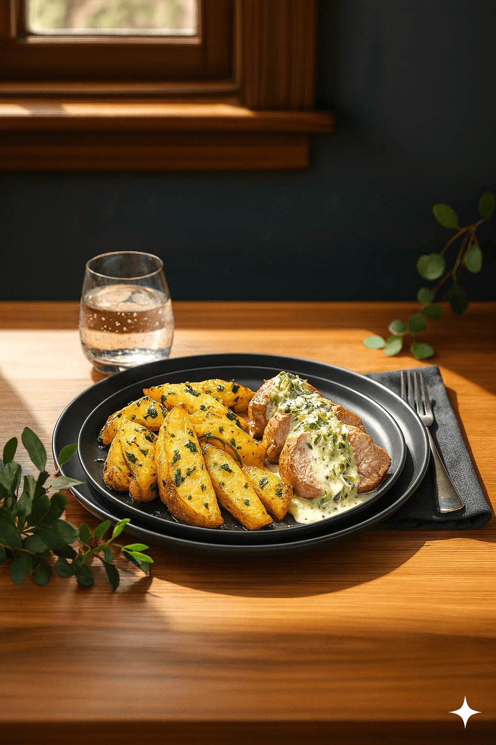 Un solomillo de cerdo exquisitamente tierno, cubierto en una suave crema de pimienta y verdeo, se sirve junto a unas papas cuñas sazonadas con el frescor del perejil y el aroma del ajo cocido, creando una combinación irresistible de sabores y texturas.